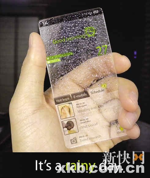 I have a idea that in the case of the screen is not lit, as if after a careful handling of the "crystal" as crystal clear. When light up the screen after this type of phone will be quite transformed, to become a "Mr. Weather", immediately showing real-time weather conditions outdoors. It is reported that, when the weather is fine, this seems the entire screen on the phone will be very "clear and bright"; if it is wet rainy day, the phone will see the raindrops on the screen pattern; if it is snowing weather or large foggy weather, then it will appear on the screen the effect of white, just like mobile phones capped with a layer of mist or frost. Even more interesting is that you only need this phone to gently breathed on the screen, the screen on the input state can immediately switch to handwriting.